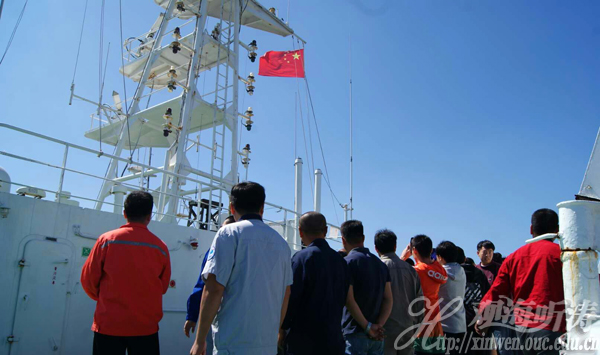 在“东方红2”船甲板上举行升国旗仪式