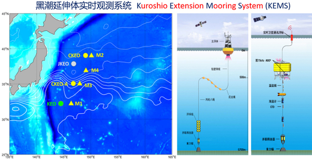黑潮延伸体实时观测系统,其中绿色点为美国KEO浮标(2004至今),灰色点为日本JKEO浮标(2007-2013),黄色为学校项目组布放的浮标