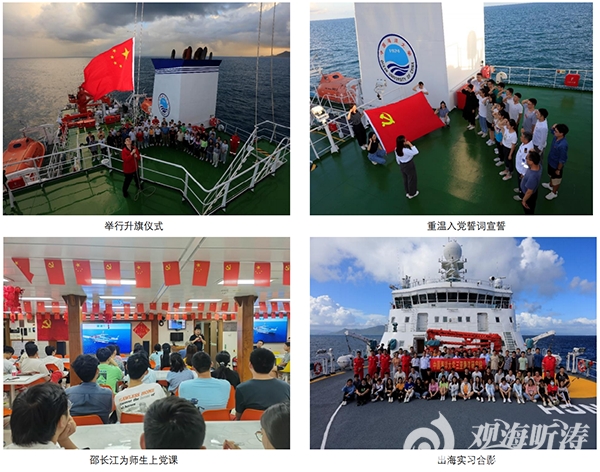 7月10日,“东方红3”船临时党支部与参加实训的三亚海洋研究院联合开展“海上学党史,启航新征程”党史学习教育。为了全面挖掘专业课程中蕴含的思想政治教育元素,推动立德树人与专业课程有机融合,“东方红3”船临时党支部结对开展“海上学党史,启航新征程”党史学习教育,将爱国主义教育元素和劳动教育的理念融入课程,实现全员全程全方位育人。全体师生迎着初升的朝阳举行升国旗仪式,党员重温入党誓词;研究院执行院长邵长江带领同学们认真学习习近平总书记在庆祝中国共产党成立100周年大会上的重要讲话。同时,双方还组织学生开展义务帮厨、实验室管理及清扫等志愿活动。