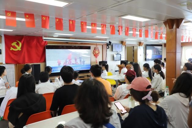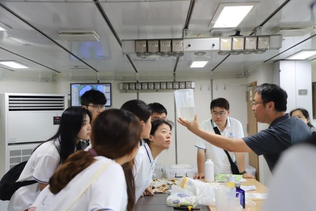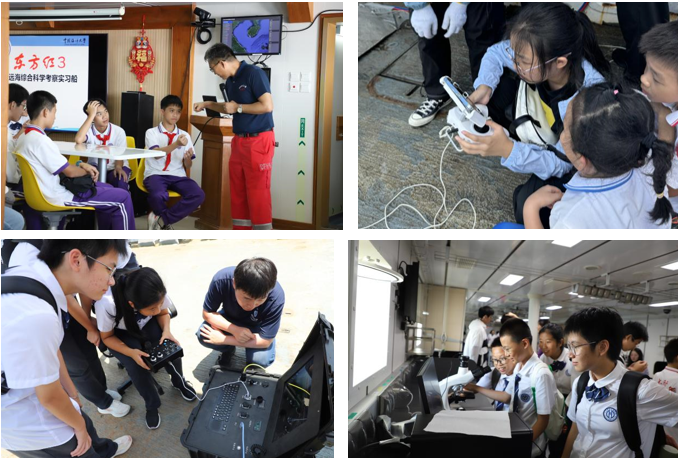 实训期间,全体师生观看了船舶离泊的过程,在甲板上举行了庄严而神圣的的升国旗仪式,齐唱国歌。随后,师生观看“东方红3”船宣传片,认真了解“东方红3”船的建造历史和肩负的科考使命,在完成安全教育和环节教育培训后,有序参观“东方红3”船的驾驶室、生活区和实验区,实地领略了“东方红3”船先进科学装备,感受了海洋科考工作的艰辛。参观结束后,师生在授课教师带领下,分别到各个实验室学习了海洋水文气象、海洋生物调查和海洋化学等方面的海洋调查知识,观摩并参与了CTD探测与样品采集、浮游生物拖网、测定pH、溶解氧、营养盐和有机碳等实验操作,不仅让同学们收获了宝贵的知识与技能,更激发了他们对海洋科研事业的浓厚兴趣。
