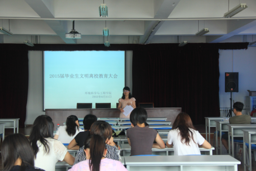 本站讯为认真有序地做好毕业生离校前的各项工作,6月15日上午,环境科学与工程学院党委在学院A517举办毕业生文明离校教育大会。此次活动由环科院团委老师廖巍主持,党委副书记刘健出席会议并讲话,2015届全体毕业生参加了此次大会。