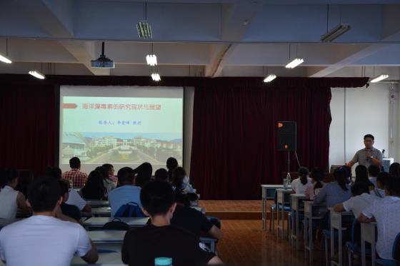 论坛进行到第二部分,环境科学系副系主任李爱峰教授对海洋藻毒素的研究现状进行了讨论与展望。李爱峰教授主要提出了该课题的研究背景,并对藻毒素来源分类及毒理性特征进行讨论,其中重点提出了贝毒素的污染现状。论坛的最后李教授还对藻毒素的医学价值等四个方面提出了美好展望,不仅加深了研究生们对此领域的认识,对日后相关科研工作得开展也起到了很好的奠基作用。