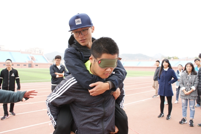 第三个环节——“盲人指路”。该环节需要由一个蒙着眼睛的人背着负责指路的人,按指定路线完成比赛,两支队伍迎面相遇时需要进行猜拳,胜者才能继续前进。第一轮中,创新创业部本来走得较慢,处于落后,但接连三次划拳胜利,在观赛者的惊呼中率先走完规定路线。第二轮生活部在比赛一开始就快速沿着路线前进,只用一次划拳胜利,就走完路线。观赛者接连感叹:“这是开了挂啊!”最终,生活部在速度和运气的比拼中获得该环节冠军。