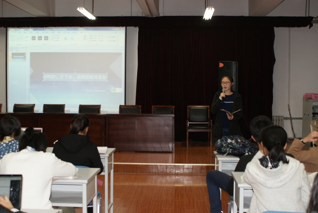 听众用掌声告别王大伟同学后,13级环境工程专业的陆维佳同学上台发言,她更为详细地解说了SRDP的发展史和参加渠道,展示了以往的SRDP结题报告书,借此还热情地介绍了SRDP计划的益处。