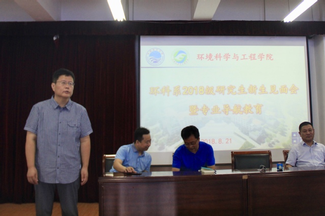 本次新生见面会暨专业导航教育分为环境科学系和环境工程系两部分举行。会议伊始,院长江文胜首先向18级研究生新生表示热烈欢迎。在昨天的开学典礼上,院长江文胜已经作为导师代表向同学们做出殷切嘱托,但在见面会上他对我院研究生新生提出了更高的要求,希望同学们能够在今后的科研生活中学会独立思考,自我学习,养成良好习惯,并祝愿同学们在学业上取得优异成果。之后,院党委书记张庆德发表讲话,他提到了研究生期间的一项重要问题——师生沟通,告诫同学们要与导师密切交流,遇到问题及时与导师商讨解决,从而建立良好的师生关系。