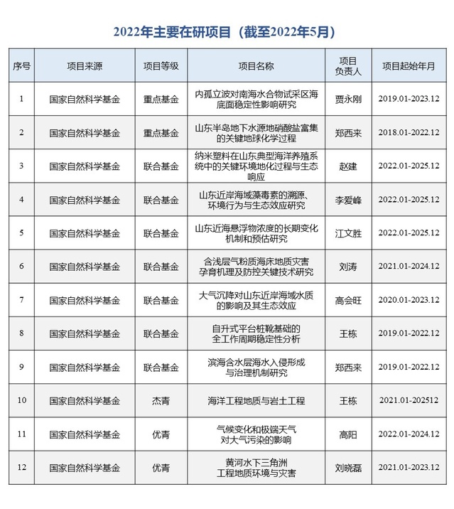 本年度学院新增国家自然科学基金面上基金11项,青年基金3项,立项数量较去年大幅提升。贾永刚教授团队申报的国家重点研发计划项目“深海采矿羽流影响监测模拟关键技术”获得立项,国拨经费3000余万元,创造了学院单项项目经费新高。截至2022年11月底,全院新增纵向科研经费合同额近5000万元。有2项科技成果进行了转让转化,实现了学院科技成果转化零的突破,截止2022年11月底,新增科技服务与咨询、新材料研发等横向项目30余项,合同经费近1000万元。