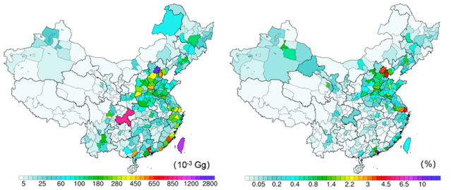 图1 2015-2019年各城市的城市绿地天然源排放量(左图)和城市绿地天然源占总天然源排放的比例(右图)