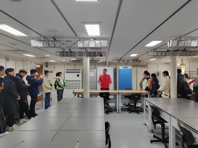 船舶中心主任王毅首先向同学们的到来表示了热烈的欢迎,并介绍了“东方红3”船的基本情况。江文胜院长时任“东方红3”船建设工程部副主任兼副总工程师兼实验室建设总监,他向同学们讲述了“东方红3”船在设计和建造过程中的经历与感受。“东方红3”船不仅吸收了外国科考船的先进设计经验,也充分考虑了其在国内建造和使用的适应性。该船具备在深海大洋开展自高空大气至海底的综合科考和资源调查、高效实施多学科海上实习实训及培养深海大洋创新型研究人才等功能,是国内首艘获得静音科考(SILENT-R)证书的新型深远海综合科考实习船,也是世界上获得这一等级证书的排水量最大的海洋综合科考船。