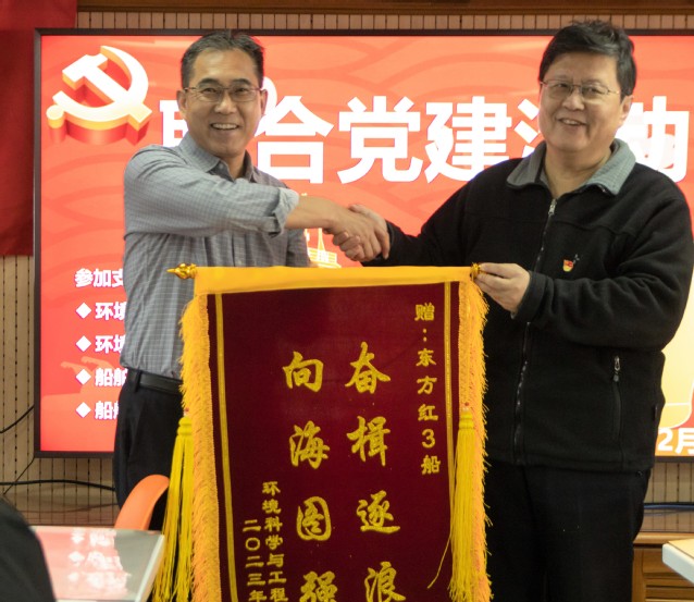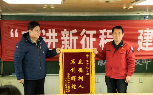 环境科学与工程学院实验室管理中心党支部书记田琳主持活动,环境科学与工程学院院长江文胜代表学院向“东方红2”船赠送了“立德树人 再创辉煌”锦旗,向该船长期以来对学院科研和教学工作的支持表示感谢。