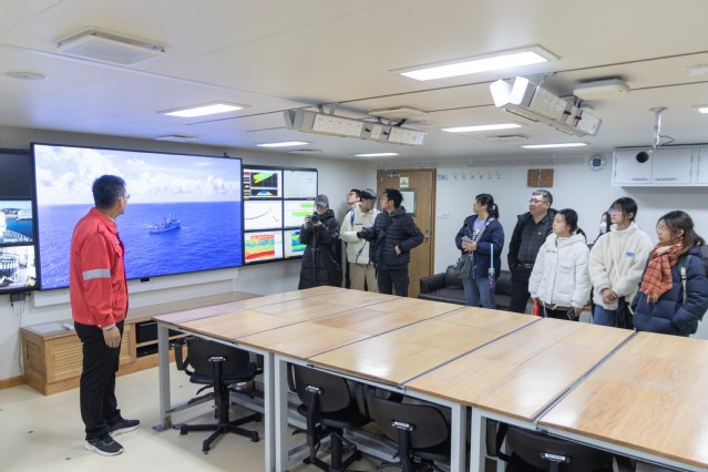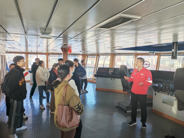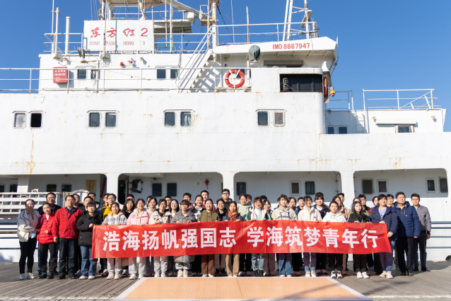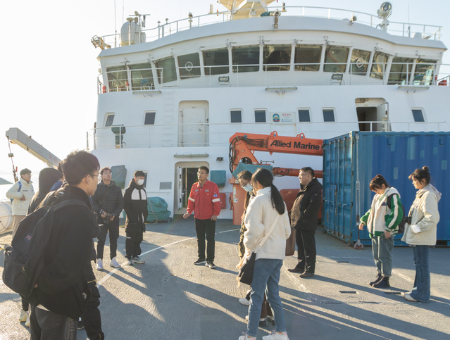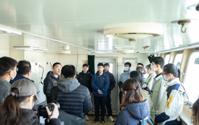 在场学生观看了“东方红3”船宣传片,分组参观了驾驶室、实验室、作业平台和生活区域,先进的技术条件和舒适的生活条件引起了同学们对海洋环境调查实习和科学考察的极大兴趣。最后,江文胜院长代表学院向“东方红3”船赠送了“奋楫逐浪 向海图强”锦旗,对其在未来海洋科考和人才培养中的发展充满信心和期待。