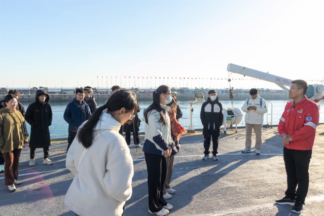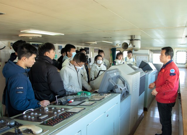 田琳结合自己跟随“东方红2”船参加的多项科研教学任务的亲身经历和切身感受,向同学们介绍了我国海洋科学调查事业的发展情况。随后,“东方红2”船政委、党支部书记宫在光为在场学生上了一堂生动的“航行中的思政课”,以自身工作中的所见所感,殷切教导青年学生珍惜青春年华,勇担新时代重任,以更好地回报国家和家庭的培养;同时也期待经过大修升级改造后的“东方红2”船会以崭新的面貌续写我国海洋科考和人才培养的新篇章。