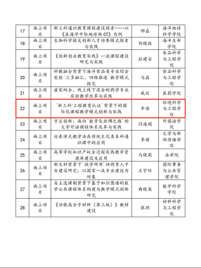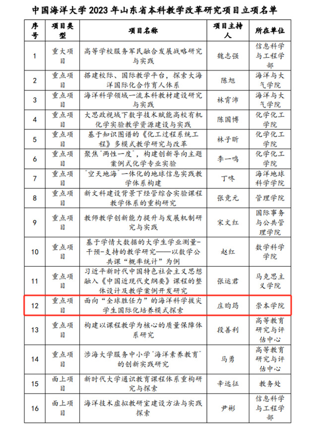 近日,山东省教育厅公布了2023年山东省本科教学改革研究项目立项名单,经过专家评审论证,我院辛佳老师的《“新工科+工程教育认证”背景下的国际化课程教学模式创新与实践》(面上项目)和庄昀筠老师的《面向“全球胜任力”的海洋科学拔尖学生国际化培养模式探索》(重点项目)获批2023年山东省本科教学改革研究项目。