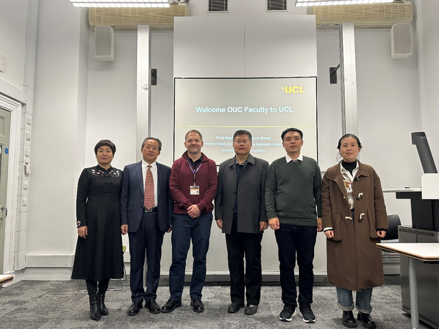 访问期间,英方组织召开了UCL-OUC科学研究合作研讨会。会上, Thorsten Stoesser教授带领的流体力学研究组分别以“Fluids group: Coastal and offshore” “Large-scale turbulence structures in open channel flow over topographical heterogeneity” “Large-eddy simulation of turbulent free surface through the Nature-like fish pass”等为主题,对海洋风电、开放水域明渠流以及鱼道流体特征进行了口头汇报。江文胜院长代表开云电竞网址环境科学与工程学院介绍了学校和学院基本情况。贾永刚教授以海洋工程地质灾害和原位观测技术为主题做了报告交流。刘晓磊教授就目前双方共同申请的国际合作项目进展以及后续工作进行了介绍。张红博士以深海采矿中的羽流特征为主题做了口头报告。报告结束后,与会人员就未来可以开展的合作研究展开了激烈讨论,初步凝练了合作方向。在此基础上,双方对开云电竞网址和伦敦大学学院开展深度合作表示期待,希望双方能够推动在科学研究和人才培养方面的务实合作并取得良好成果,后续建立长期稳定的合作模式。