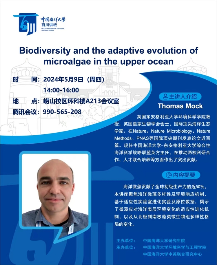 研究生百川讲坛 | 第309讲 Thomas Mock:Biodiversity and the adaptive evolution ofmicroalgae in the upper ocean