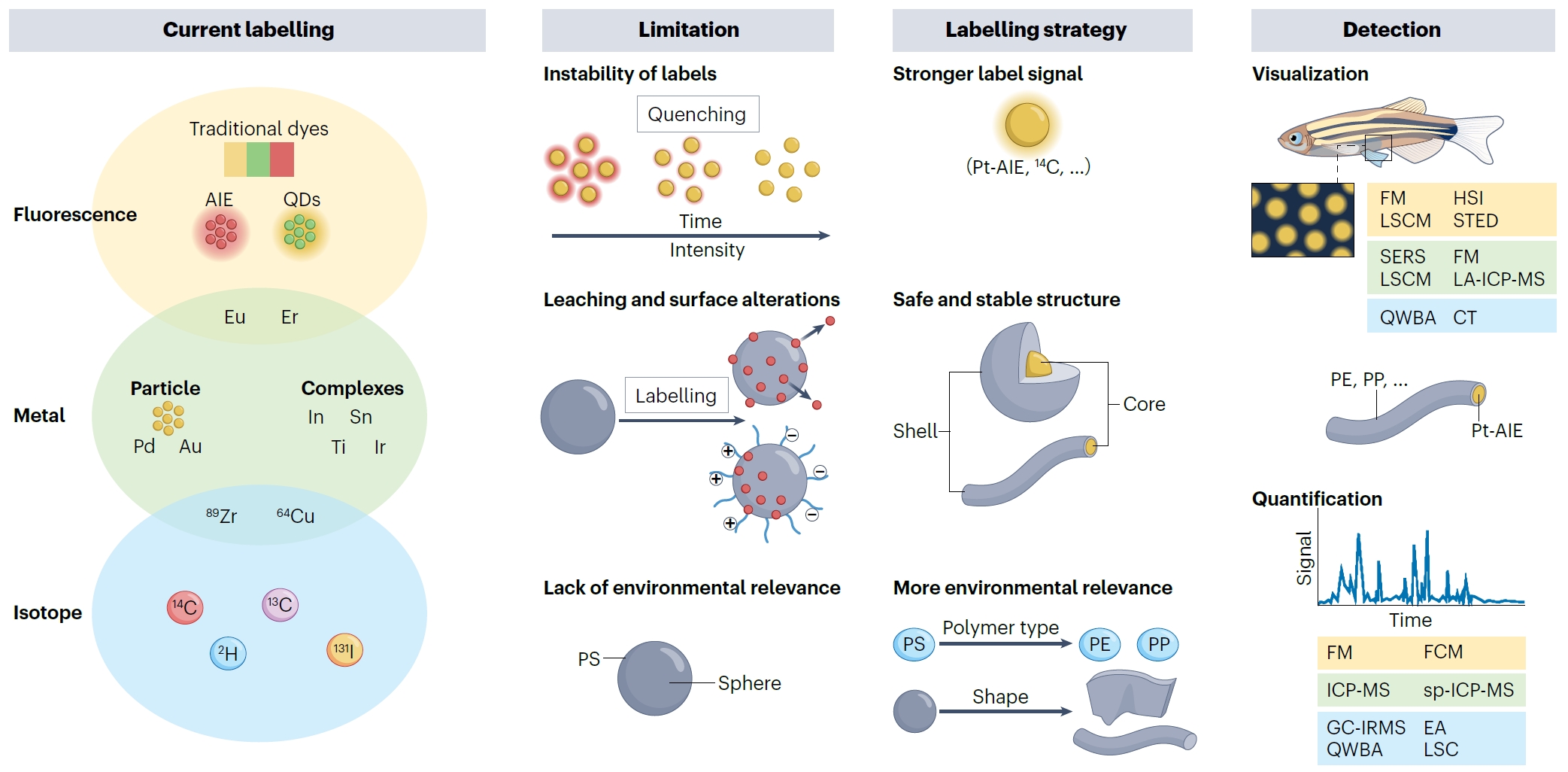 该文章首先梳理了当前MNPs主要检测方法的发展历程、优缺点与适用范畴;重点总结了生物体中MNPs的体内和体外检测方法,并针对不同类型生物提出了定制化的前处理和检测策略,以实现MNPs的准确识别与定量(图 1);获得了MNPs在人体各组织和器官中的分布规律,剖析了MNPs与健康风险的潜在关联;针对生物体内MNPs难以追踪与定量的难题,系统评述了MNPs的标记方法及局限性,并提出了MNPs同步示踪与检测的新策略(图 2);最后,鉴于生物样本稀缺、MNPs含量低、样本前处理复杂等局限性,提出了基于机器学习辅助MNPs快速识别与全面表征的新思路。该成果提供了生物样本中MNPs检测与表征的系统性解决方案,推动了MNPs分析全流程的国际标准化进程,为MNPs的生态与人体健康风险评估提供了重要支撑。