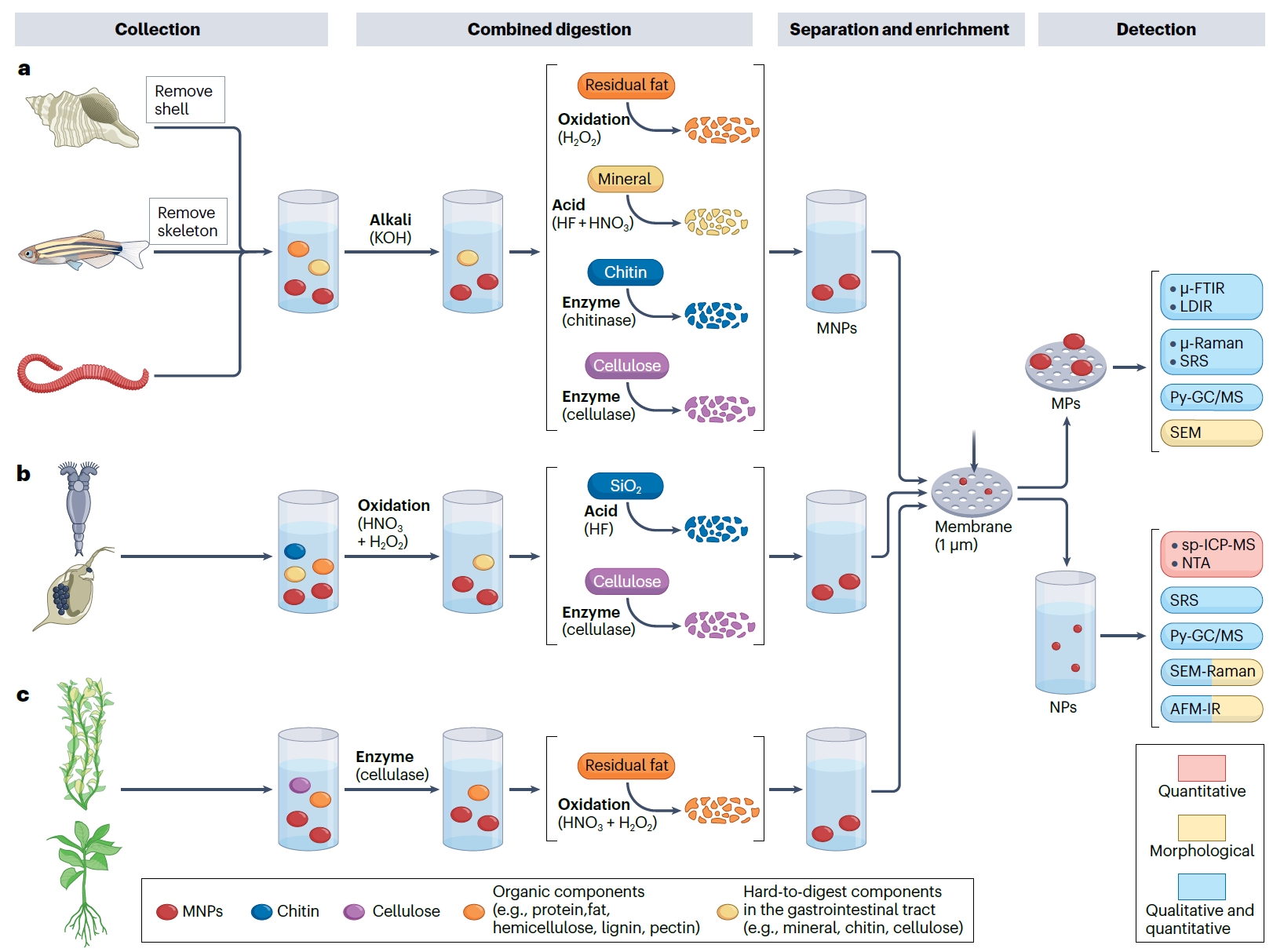 图1. 不同类型生物中MNPs的消解、分离、富集和检测新策略。