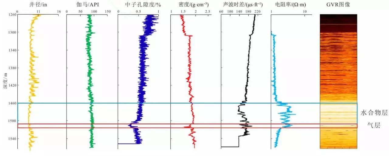以某井为例(下图),1460-1510m层段井径曲线较为规则,自然伽马数值较上部地层略低,中子孔隙度和密度测井曲线无明显异常,声波速度变快,电阻率数值明显增加,GVR成像上表现为高亮特征,综合测井曲线解释,确定该层段为水合物层。
