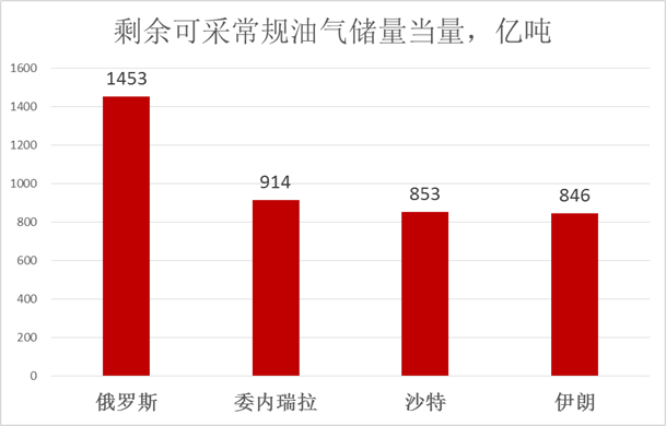 论剩余的常规油气可采储量,全球最高的四个国家分别是:俄罗斯、委内瑞拉、沙特、伊朗。