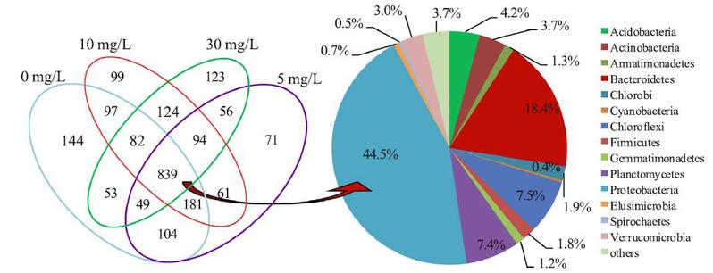 高孟春教授团队、彭昌盛副教授团队在深入分析探讨二氧化钛、金属银、氧化铜、二氧化硅等纳米颗粒物对环境生物处理系统影响过程中,发现低剂量的纳米材料就会对微生物系统的群落结构、酶系统等表现出显著的影响,微生物一般表现为强烈的负反馈效应,应该引起广泛重视。如在探讨不同浓度的二氧化硅纳米颗粒对微生物群落的影响时,发现5-30 mg/L的颗粒材料对反应器的COD去除效率有一定的影响,而对磷的去除影响非常显著,5 mg/L的纳米颗粒材料就会降低硝酸盐的还原速率。