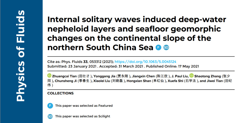 5月17日,国际著名流体力学杂志《Physics of Fluids》发表了团队青年讲师田壮才关于南海内孤立波悬浮深海沉积物并改造海底底形的最新研究成果“Internal solitary waves induced deep-water nepheloid layers and seafloor geomorphic changes on the continental slope of the northern South China Sea”。最新研究发现内孤立波所造成海底沉积物悬浮在南海北部陆坡可达1500米水深,并成为《Physics of Fluids》的 Fearured and Scilighted 文章。