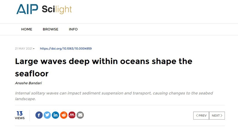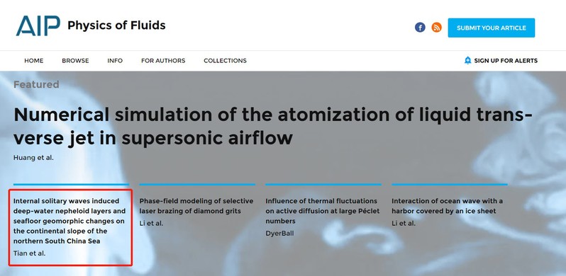 该文被选为当期的Featured Work,在Physics of Fluids首页重点展示,并被美国物理学联合会《科学之光》(AIP Scilight)以“Large waves deep within oceans shape the seafloor”为题进行了专访报道,该项研究为进一步研究深海物质输运奠定基础。