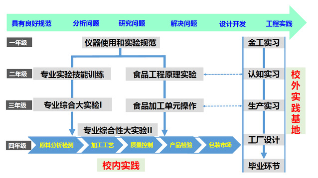 为达成食品科学与工程学院本科专业人才能力培养的需求,体现专业培养和能力需求的体系化和完整性,贯彻提高学生自主性和能力达成度的实验教学观念,实验教学打破了传统的教学模式,将上游、中游、下游实验教学内容打通设计,分基础性实验、综合性实验和研究性实验三个层次。