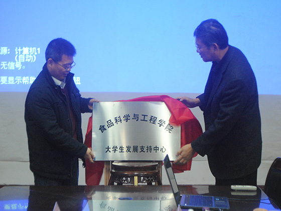 本站讯 11月27日下午,由食品科学与工作学院主办的食品学院“大学生发展支持中心”揭牌仪式在鱼山校区六二楼召开。出席本次仪式的有教务处副处长宋宇然、学生处科长王伟莉、校就业指导中心科长乔宝刚、食品学院党委书记林洪、副院长王富龙、团委书记王渊及食品学院各班班主任、研究生、本科生代表。