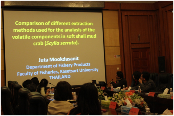 研讨会由牟海津副院长主持。首先,薛长湖院长介绍了我院的教学与科研情况,Suriyan Tunkijjanukij 院长介绍了泰国来访的教师和农业部官员。随后,泰国农业部水产部门官员Supakant Chaichotranunt先生作了题为:“泰国糙海参的养殖与繁育”的报告,食品科学与工程学院唐庆娟副教授作了题为:“海参活性成分与加工技术”的报告,泰国农业大学水产学院教师Juta Mookdasanit 博士作了题为:“不同提取方法对锯缘青蟹挥发性成分检测的影响比较”的报告。此次“中-泰”国际合作项目研讨会主要围绕海参的养殖及加工技术展开,整场研讨会气氛高涨,参会人员讨论热烈,食品学院师生均表示受益良多。此次研讨会为双方进一步深入交流与合作夯实了基础。(文/唐庆娟;图/武娟)