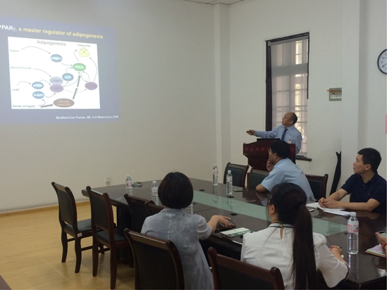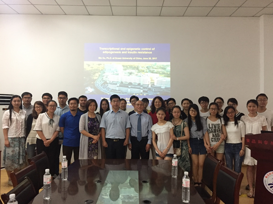美国密西根大学(University of Michigan)Bin Xu博士、副教授受食品科学与人类健康实验室的邀请于近期访问我院。2017年6月28日,Bin Xu教授在六二楼104会议室向食品学院师生做了名为的“Transcriptional and epigenetic control of adipogenesis and Insulin resistance”演讲报告。报告中,Bin Xu教授围绕着脂肪组织形成及胰岛素抵抗在转录水平及表观遗传学水平上的分子机理,介绍了其研究室多年来的研究成果,尤其是在长链非编码RNA及核受体PPARg相互作用方面做了精彩的阐述。Bin Xu教授还对密西根大学的办学条件、研究水平现状进行了简介。会后我院师生与Bin Xu教授就相关科学问题展开了踊跃而又深入的探讨。本次Bin Xu教授来访还将进入实验室,展开亲身示范及实际教学,将其实验室使用的一系列分子生物学新研究手段传授给相关方向研究生,帮助他们提高技术水平及科研深度。