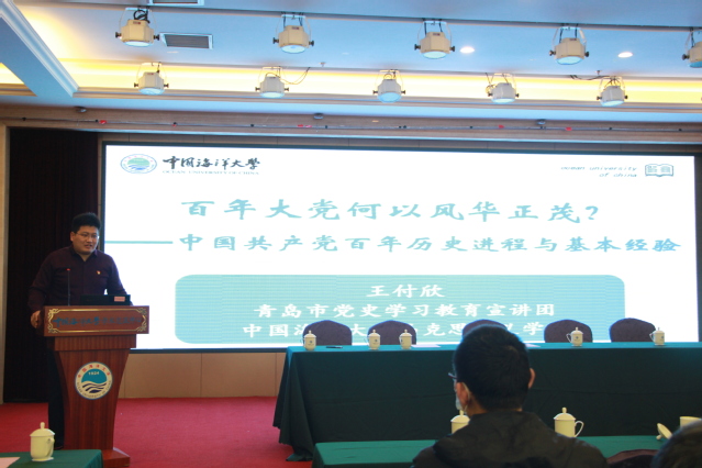 青岛市党史学习教育宣讲团成员、马克思主义学院党总支副书记、副院长王付欣以《百年大党何以风华正茂——中国共产党百年历史进程与基本经验》为题,结合中国共产党百年历程与基本经验,向大家作了精彩报告。