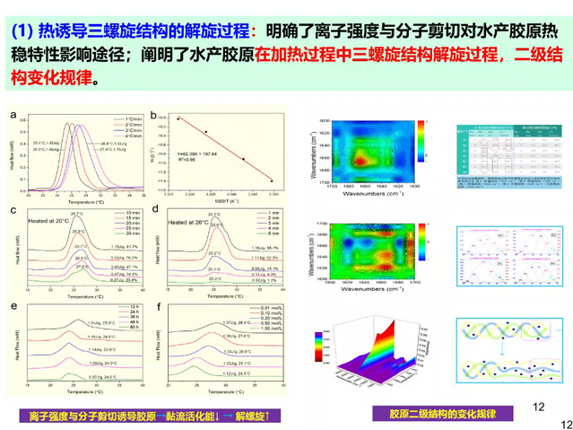 以海参为例,其主要食用部位是体壁,主要由胶原蛋白组成。由于刺参中“自溶酶”的存在,在刺参捕捞后数小时内就会出现自溶现象。在刺参加工时通常会对其进行热处理,以灭活其体内的自溶酶。刺参胶原蛋白在热处理过程中会发生结构的变化,这些都会对刺参体壁有重要的影响作用。而且,即使海参失去了酶和微生物的活性,也能发生非酶自降解。非酶降解会破坏海参产品的质量并缩短保质期,造成巨大的经济损失。针对上述科学问题,展开了热诱导三螺旋结构的解旋过程、三螺旋结构解旋的分子机制,以及胶原肽链非酶断裂位点及其非酶裂解分子途径的研究。