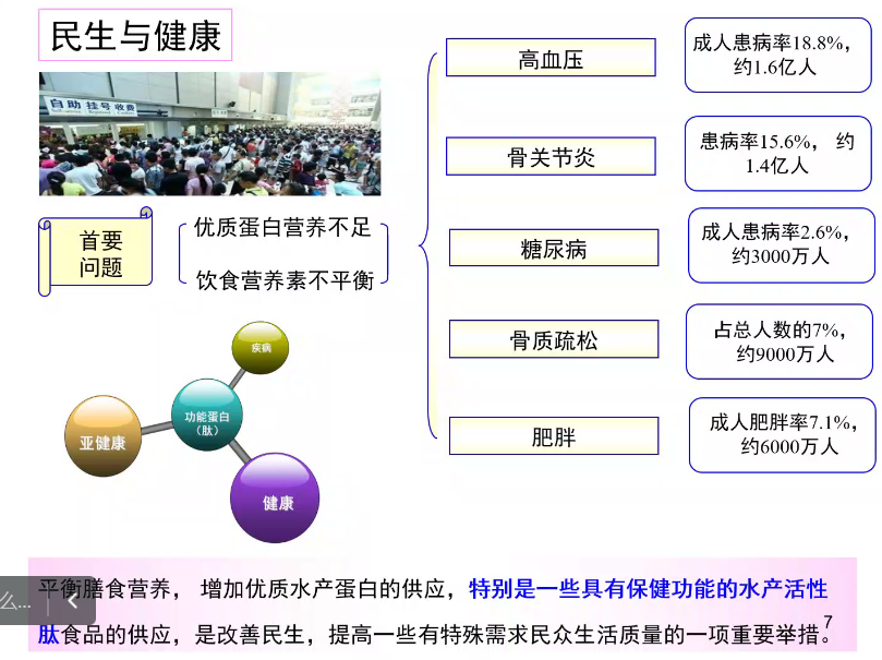 讲座伊始,侯虎老师介绍了海洋功能蛋白与多肽与国民健康的关系。目前我国居民患高血压、骨关节炎、糖尿病、骨质疏松、肥胖等慢性疾病的比例日益增加,影响国民健康的首要问题就是优质蛋白质营养不足与饮食营养素不平衡。海洋是21世纪蛋白质“粮仓”,海洋能提供的食物要比陆地全部可耕农田提供的食物多上千倍,且海洋食物较陆生食物含有更为丰富的活性物质。因此,通过增加优质水产品的供应,特别是一些具有保健功能的水产活性肽食品的供应,来平衡国民膳食营养,将会是改善民生、促进国民健康的一项重要举措。