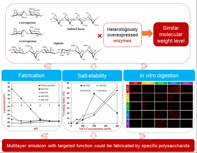 以上系列研究的特色在于以实验室前期掌握的系列海洋多糖特异性降解酶为关键工具,对多糖分子量进行剪裁,得到系列分子量、以及相同分子量、不同一级结构的多糖,清晰地建立了多糖分子结构特征与多层乳液消化特性之间的构效关系,研究成果有利于构建消化命运可控的乳液递送体系。