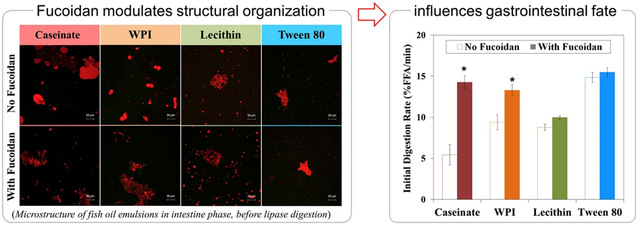 Yaoguang Chang, David Julian McClements. Influence of emulsifier type on the in vitro digestion of fish oil-in-water emulsions in the presence of an anionic marine polysaccharide (fucoidan): Caseinate, whey protein, lecithin, or Tween 80. Food Hydrocolloids. 2016, 61, 92-101.