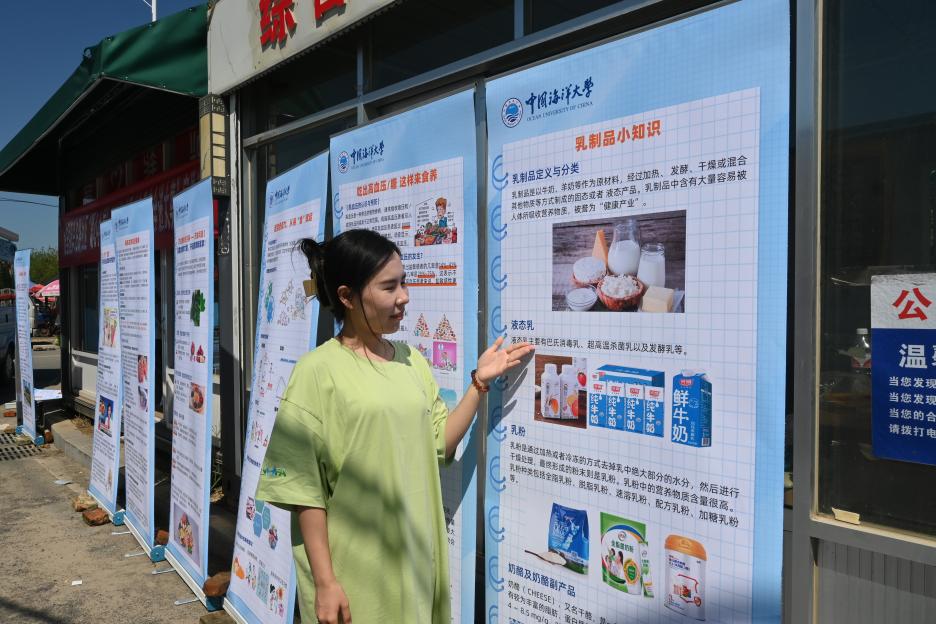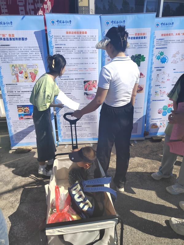 清晨,泊里大集已经热闹非凡,实践团指导老师朱嘉铭带领团队成员早早地来到现场,精心布置着活动场地。十个主题鲜明的食品安全与营养相关知识展架依次排开,成为大集中一道亮丽的风景线。这些展架不仅涵盖食品储存、膳食营养搭配、认识食品添加剂、怎样吃海鲜更健康等生活中常见的营养与健康科普小知识,也包括对高血压、高血糖、痛风等老年人关注的疾病的食养方法,以图文并茂的形式生动地向人们展示了食品营养与安全知识。