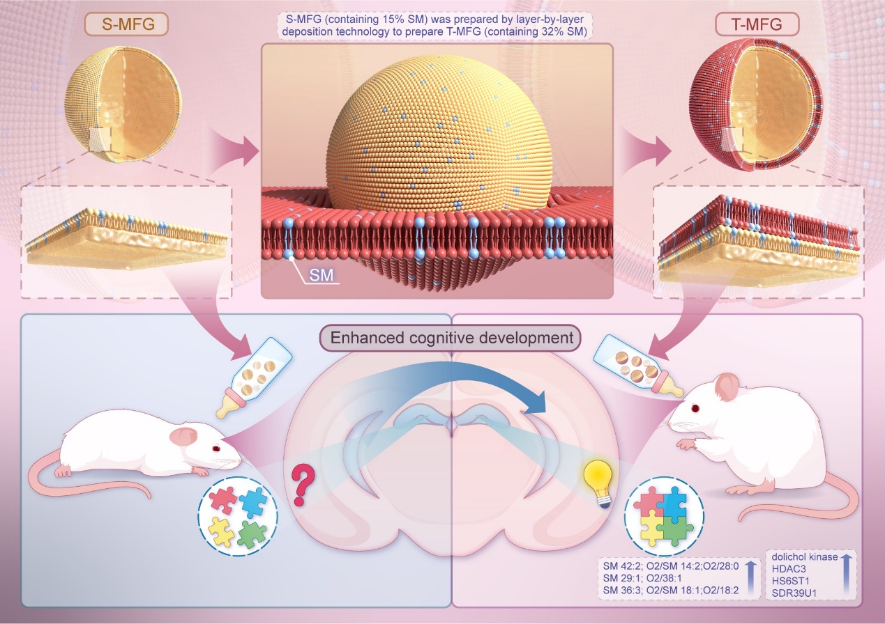 该研究基于乳脂肪球磷脂组分重塑和三层膜空间结构重构双重母乳化策略,对人乳乳脂肪球进行了全面模拟,同时系统揭示了母乳化乳脂肪球通过调控神经发育、脂质代谢与肠道菌群协同增强幼鼠认知功能的新机制,为高端婴配奶粉MFG功能组件母乳化奠定了理论研究基础,提供了应用技术支撑。