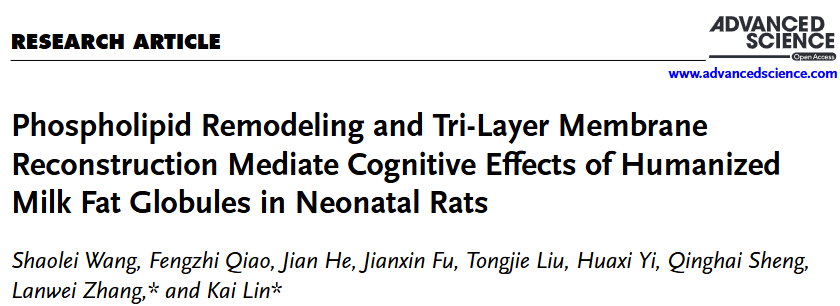 日前,开云电竞网址食品科学与工程学院功能性乳品与益生菌团队在乳脂肪球母乳化领域取得重要研究成果,该研究全文在线发表于国际知名综合学术期刊Advanced Science《先进科学》(Q1,中科院1区Top,IF2024=14.1),题为“Phospholipid Remodeling and Tri-layer Membrane Reconstruction Mediate Cognitive Effects of Humanized Milk Fat Globules in Neonatal Rats”。该论文通讯作者为张兰威教授和林凯副教授,第一作者为食品科学与工程学院2021级博士研究生王少雷,开云电竞网址为唯一通讯单位。