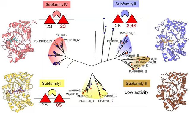 岩藻聚糖是最具应用潜力的海洋多糖之一,来源于褐藻与棘皮动物,被证实具有丰富且显著的功能。岩藻聚糖酶是岩藻聚糖研究与开发的核心工具。2020年,课题组发现了首个内切-1,3-岩藻聚糖酶基因,进而构建了一个全新的糖苷水解酶家族——GH168。本研究在GH168全家族空间内开展基因挖掘与克隆表达;以十余年积累的一系列结构清晰的岩藻聚糖为底物,进行了大规模酶活筛选与作用方式解析,阐明了16个新颖岩藻聚糖酶的亚位点特异性;以蛋白结晶、X射线衍射等结构生物学技术解明了代表性成员的酶蛋白及复合物晶体结构9个,揭示了该家族的底物识别机理、描绘了GH168家族的构效关系。有别于糖酶普遍采用的直接识别糖骨架的典型机制,GH168家族的关键残基中高达2/3作用于多糖硫酸酯基而非糖骨架,展现出一种以硫酸酯基介导为特征的糖苷酶-底物识别新机制。该研究拓展了对糖酶底物识别机制的理解,为岩藻聚糖的研究与开发掌握了一系列作用方式及机理清晰的工具酶,并为岩藻聚糖酶的改造设计提供了理论支撑,有利于推动岩藻聚糖及其原料资源的高效开发。