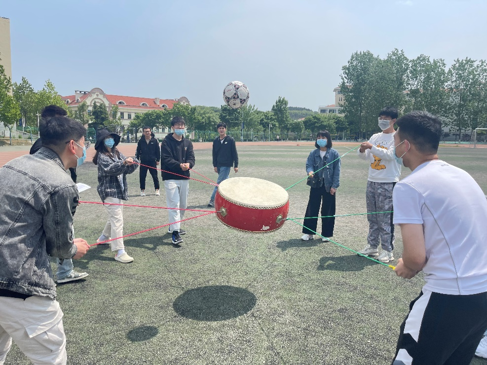 声势最浩大要数“击鼓颠球”项目了,队长喊“起!”之后,八名队员齐心协力,运用练习中总结到的经验与技巧,在一次又一次的不断尝试中,连续颠球的纪录也在不断被后续参赛的队伍刷新。有的同学负责指挥移动方向,有的同学努力调整球的弹跳高度和方向,伴随着一次次的起球,大家在配合越来越默契的同时,感情也在不知不觉中升温。