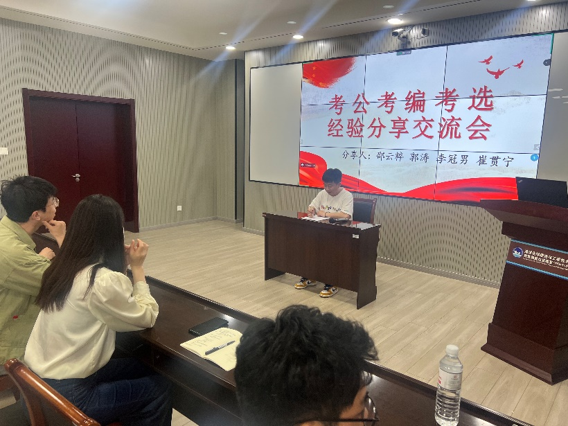 化学化工学院考公考编考选经验分享会于2022年6月9日14:00-16:00在化学化工学院三楼会议室举行。郭涛、李冠男、崔贯宁和邵云粹4位2022届毕业生分享了考公考编考选的经验。