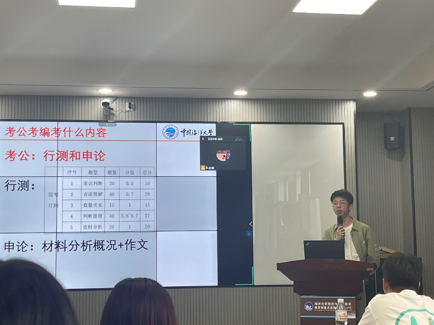 崔贯宁以什么是考公考编为切入点,向大家介绍考公应如何选择与准备。他着重为大家介绍了笔试注意事项,提醒大家在备考环节注重要多练习多刷题,保持题感。他还介绍了考公的时间节点,建议大家合理安排时间,造作规划与安排,并祝愿师弟师妹们尽早明晰方向,慎重选择,拼搏上岸。