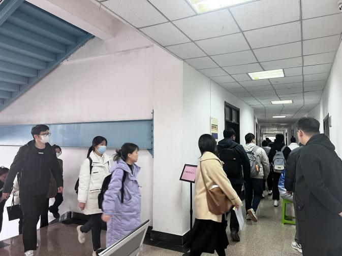 复试分为思想政治考核、面试、实验考核三个阶段,考生们统一在化学楼大厅候考,在志愿者的协助下,有序前往考场。