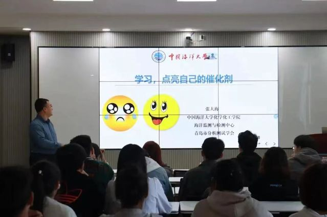 首先,由张大海老师向同学们进行化学知识的科普与人生规划教育。张大海老师的讲座精彩纷呈,从“阅己、越己、悦己”三个方面教导同学们不虚度光阴,保持良好的学习态度,让同学们感受化学,支持化学,爱上化学,感受到化学的魅力。