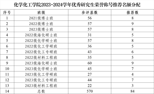 “优秀研究生干部”:每班级推荐不超过2名候选人(如果是2人,需排序);“优秀研究生”推荐名额分配见下: