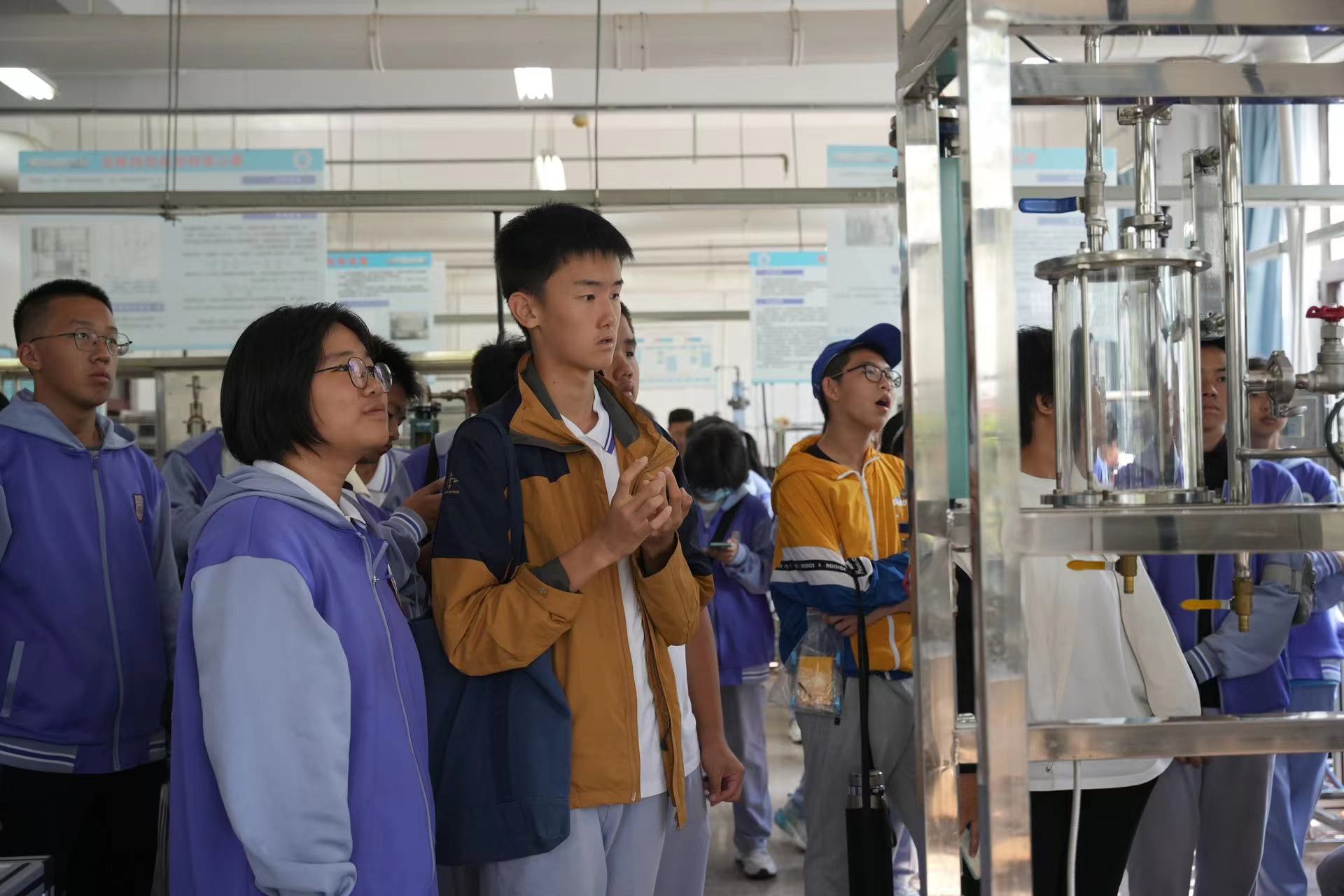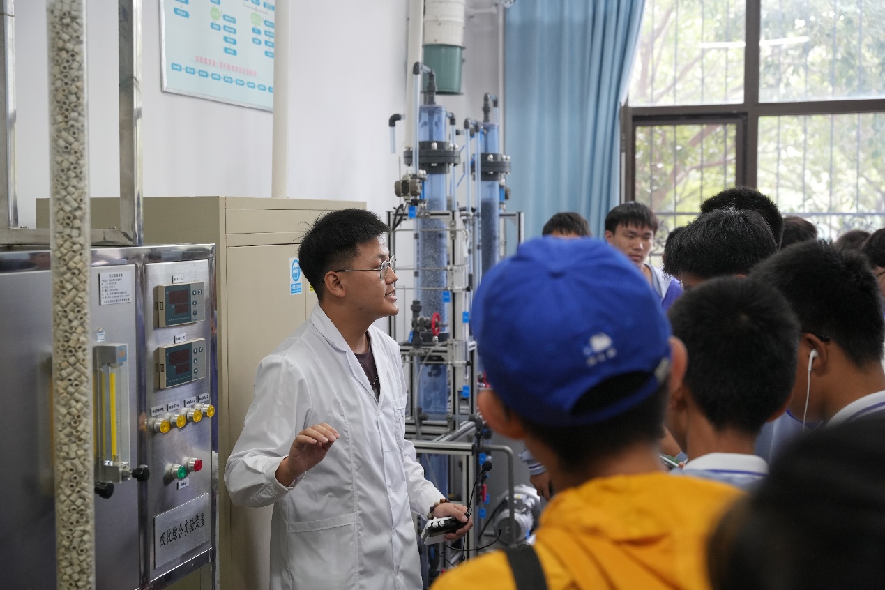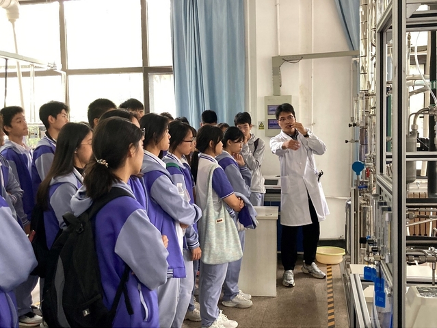 在志愿者讲解员的带领下,学生们参观了化工本科教学实验室,了解吸收、精馏、膜分离等化工单元操作中的基本原理,化工生产过程中热集成进行节能降耗的措施,以及大学生参加Chem-E-Car竞赛的作品。志愿者们结合生活案例,深入浅出给高中生们科普了海水淡化、伯努利方程、传热基本形式等知识。参观过程中,同学认真聆听讲解,仔细观察设备特征,积极提升科学素养。