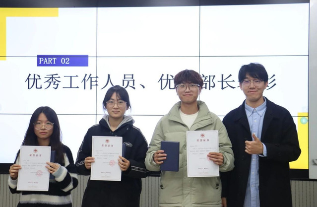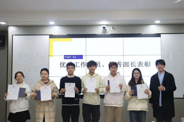 由学生会指导老师王祖甜为优秀部门负责人:成发部:刘柯、办公室:张佳旺、网宣部:刘子渝颁发荣誉证书和奖品。