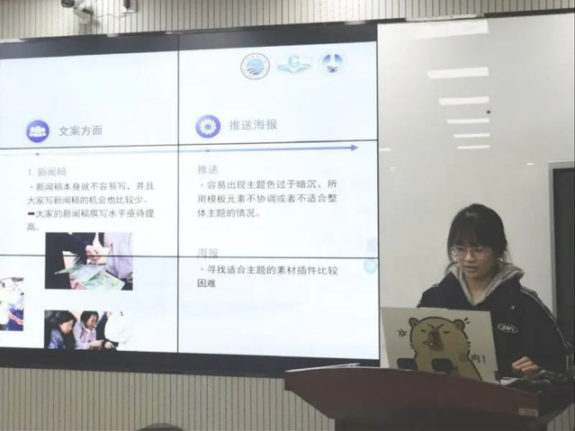 部门负责人刘子渝进行工作汇报,主要围绕秋季学期工作完成情况、问题改善措施和新学期工作展望三方面介绍了网宣部的相关工作。针对在迎新杯篮球赛、五院运动会、宿舍文化节等活动的宣传工作中出现的摄影、推送方面问题,进行了反思并提出了解决方法。随后学生会指导老师王祖甜老师及主席团成员针对活动的抓拍能力提升和新闻稿撰写能力提升的问题给出了建议。