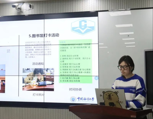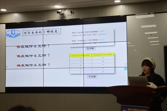 部门负责人贺文茜进行工作汇报,汇报内容从工作内容展示、工作总结与反思、问题解决方案和未来展望四个方面展开。对于在活动组织中出现的人员协调问题和物资准备问题给出了解决方案。随后王祖甜老师和主席团成员就成发提案反馈、维护学生权益方面进行了详细的了解和提问。