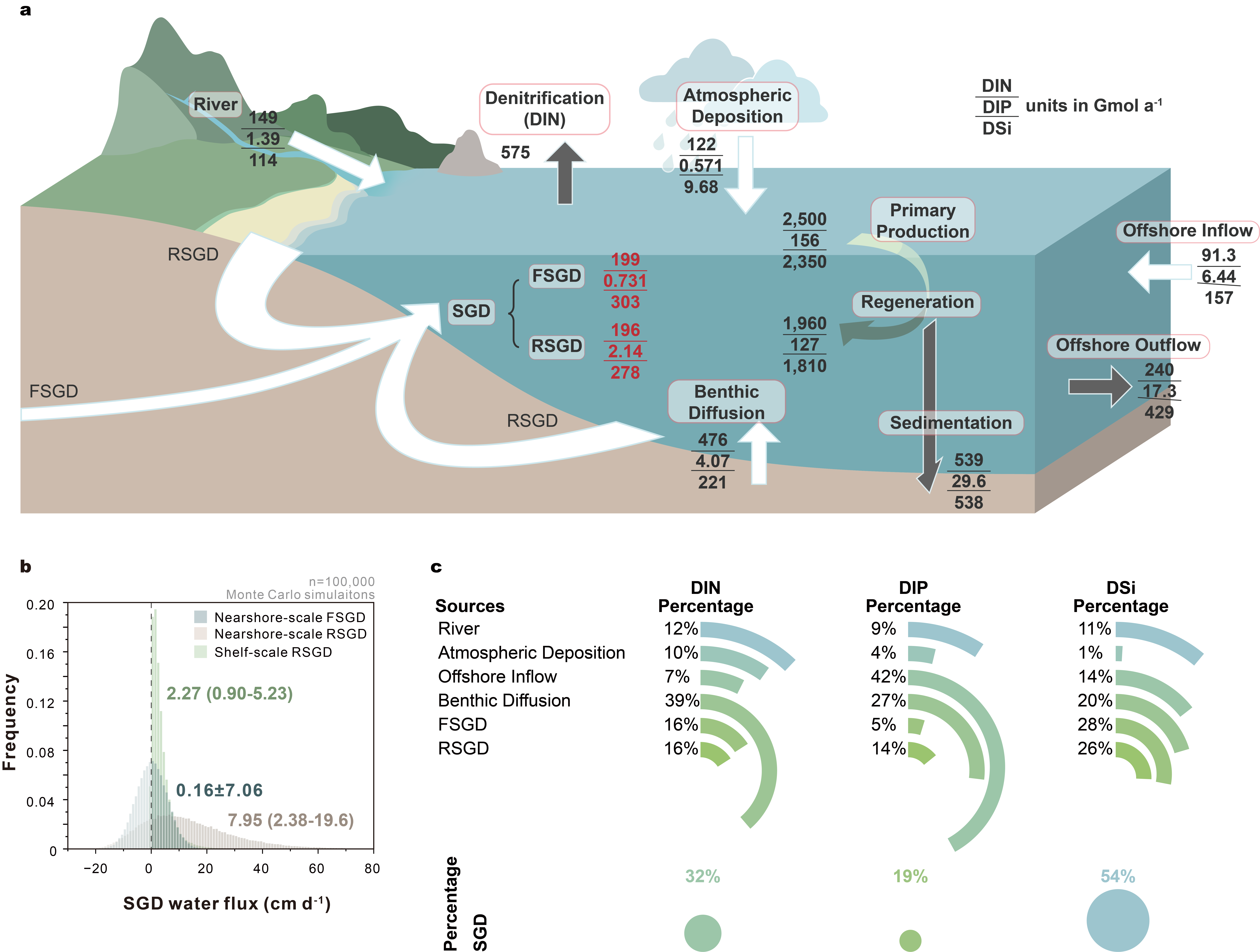 海底地下水排放(Submarine Groundwater Discharge,简称SGD),是指所有在海底界面发生的水交换过程,包括陆源淡水地下水(FSGD)和循环海水(RSGD)两部分。SGD是驱动陆海界面物质交换的关键动力过程,对海岸带生物地球化学循环具有至关重要的影响作用。目前,我国业已开展的SGD研究大多关注河口、海湾等局域尺度,尚缺乏对中国近海SGD通量的整体认识。由于方法学的限制,区分研究不同类型SGD通量及其物质贡献十分困难,导致量化结果的不确定度难以准确估算,因此无法纳入我国近海营养盐收支的评估模型中。