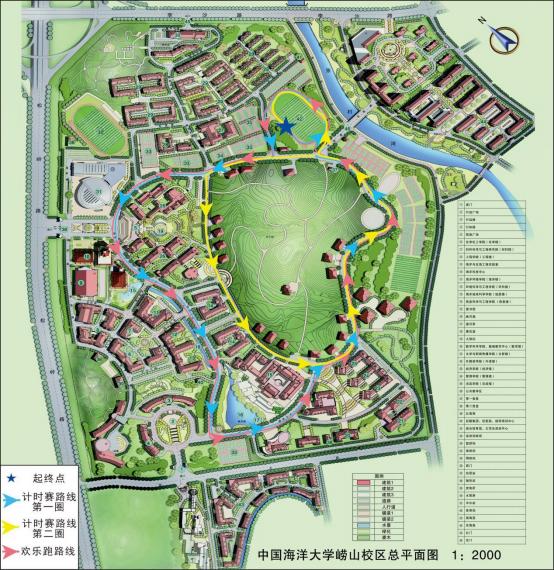 崂山校区东区田径场-梧桐大道-国槐大道-樱花大道-国槐大道- 崂山校区东区田径场。